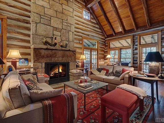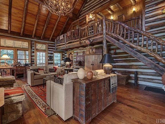 Vintage logs, a cedar shake roof, expansive rear covered porch looking out on your own private dock and canoe launch. The Cullasaja River is the rear boundary of this property. It is fairly calm so the conveyed canoes can immerse you in nature. This home and its environment are simply beautiful. Tom Chambers built this exceptional, mini-estate to evoke the ambiance of a hunting lodge. It is constructed of recycled logs, with oak and wormy chestnut interior surfaces, although relatively new, it appears very old. Owners have brightened the interior with additional windows, and skylights, encapsulated the basement and enclosed a basement room to provide a heated workshop and storage. Three additional, recently acquired undeveloped lots provide a buffer along the east side. Totaling about 2.76 acres, Fishtales is private, yet very close to the vibrant activities of Highlands. Catch trout off your dock, and enjoy leisurely meals on the expansive covered porch overlooking the water. Two wood burning fireplaces: 1 in the living room, 1 on the covered rear porch, and a third with gas logs in the den to take the nip out of the air on cool summer nights. Rustic luxury! An extraordinary home which will seem to transport you back a hundred years into another world!