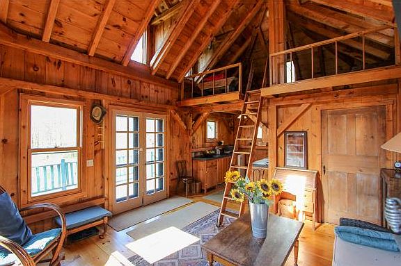 Idyllic Getaway Retreat. Surrounded by almost 80 Acres of LAND with meadows, woods and views, this 1 BR, 1 Bath 308 sq. ft. Post and Beam Cabin overlooks a pond. Built in 2003, by Rick Lazarus, historic barn expert. Light streams into surprisingly spacious open living area. Adorable kitchen with slate counters from old schoolhouse. Climb vintage library ladder to 2nd Floor Sleeping Loft. Woodstove. French Doors to Deck. Shed. IMAGINE solitude and quiet from all the hustle and bustle just 15 minutes from Ithaca. Come here and youâll want to stay forever!