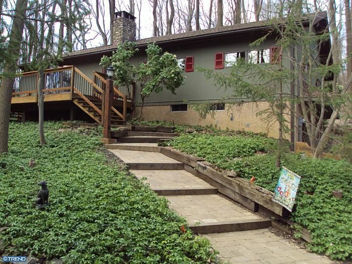 Lovely 3BR, 2 bath rancher on stunning Thompson Mill Road. Adjacent to protected 121 acre parcel through Natural Land Trust, Media, PA. Freshly painted throughout. Front and rear decks, patio and paver walkway. Winding stone drive. 2 car garage and workshop in basement. Hardwood floors in LR, DR. Front and back of home in Hardi-Plank. Right and left elevations in T 111. High ceilinged LR with 2 story stone FP face. Wood dumbwaiter from lower level. Upper storage over DR. Roof is 2 years old. Central Air. Main level laundry. Terrific detached garage (27 x 16) w high ceiling and detachable section over garage door allowing motor home access. Outstanding Council Rock North schools. Access to attic storage by pull down stair over basement stairway. Wooded. MBR w 2 closets including a walk in. Wonderful views in all directions. Paradise awaits.