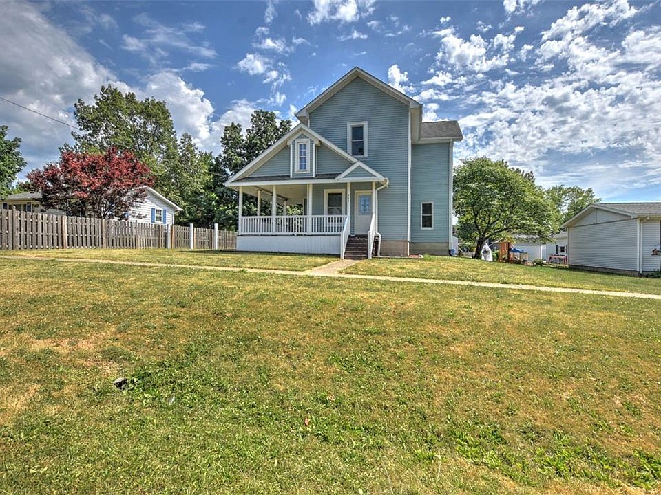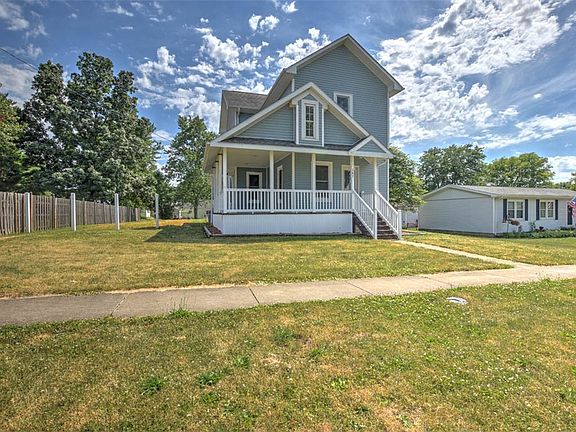 Experience the charm of small-town living with this beautifully remodeled home. The inviting wrap-around porch sets the stage for what's inside. The stunning kitchen, complete with a center island, stainless steel appliances, and updated light fixtures, seamlessly opens to a spacious dining room and family room, creating a perfect space for entertaining. Step outside through the sliding doors onto the deck, overlooking a large backyard, perfect for outdoor activities. The home also boasts a stand-up crawl space with a gravel floor, providing excellent storage options.