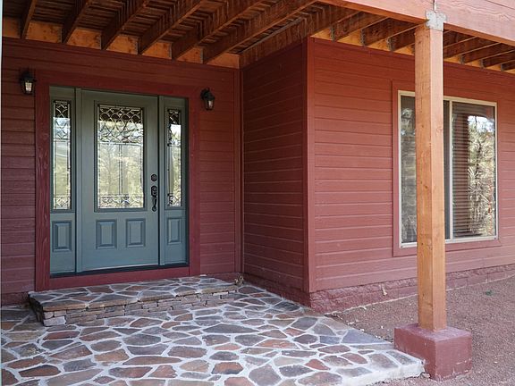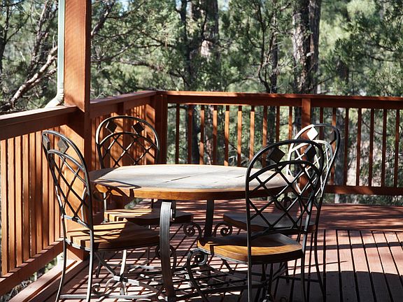 - Exterior Features: Covered Porch/Deck, Tall Pines on Lot, In the Trees, Covered Patio, View of Mountains