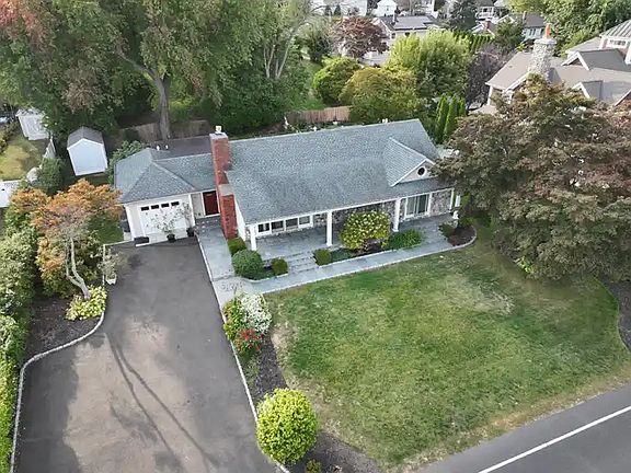 Experience the best of coastal living in this inviting 3 bedroom 2 full bath single-level ranch, where sweeping views of Long Island Sound fill nearly every room. The vaulted living and dining area feels bright and airy, centered around a rustic stone fireplace that sets the stage for cozy gatherings. The kitchen offers stainless steel appliances, granite countertops, and natural gas cooking ideal for both everyday meals and entertaining. With three bedrooms and two full baths, the layout provides flexibility and comfort. The third bedroom, complete with a private entrance, is perfect for guests, a home office, or a quiet retreat. Tile floors throughout give it that beach house feel. Large windows bring in natural light and water views. Step outside to a spacious deck for barbecues and sunset views, or enjoy your morning coffee on the covered porch overlooking the Sound. Go kayaking, paddleboarding, or simply unwind at nearby Cove Island Park, which offers beaches, a marina, tennis courts, and picnic areas. A fenced garden adds privacy and charm, and a one-car garage completes the picture.