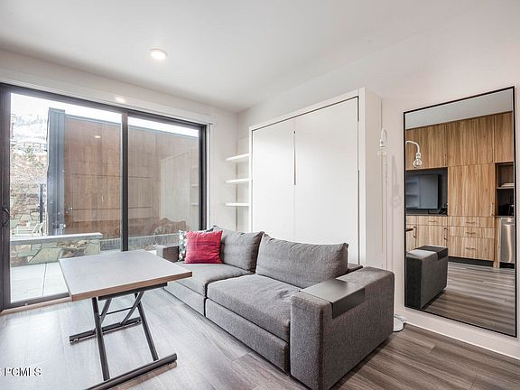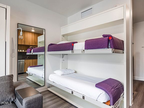 Discover the perfect blend of modern convenience and mountain charm in this stylish 338-square-foot studio at YotelPad Park City. Located on the first floor for seamless access to the resort's best amenities, this west-facing unit offers stunning partial resort views, with breathtaking sunsets over Canyons Village. Designed with European-inspired efficiency, this studio features a queen murphy bed and twin bunk beds, maximizing both space and comfort. The sleek kitchen is equipped with a full refrigerator/freezer, microwave, two-burner stove, dishwasher, and garbage disposal, offering everything you need for a weekend getaway or an extended stay.