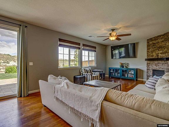 Mountain and canyon views from this highly upgraded beautiful two story home in Canyon Pines. Located next to Somersett but with low HOA! Enjoy the amazing views while hiking the BLM trails with direct backyard trail access to the Peavine Mountain area. Invite family and friends to relax around the outdoor patio seating and fire pit or enjoy the evening with the new outdoor kitchen including a 60 inch grill, side burner, sink, under counter cabinets, and large bar top with plenty of seating...all hand built.