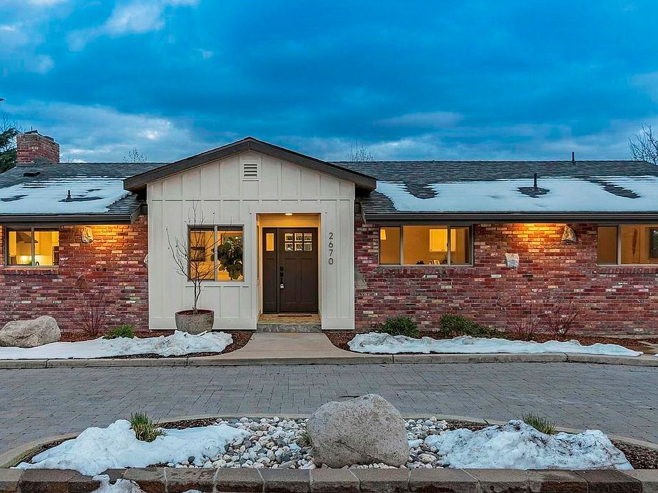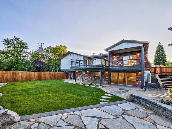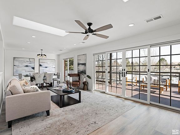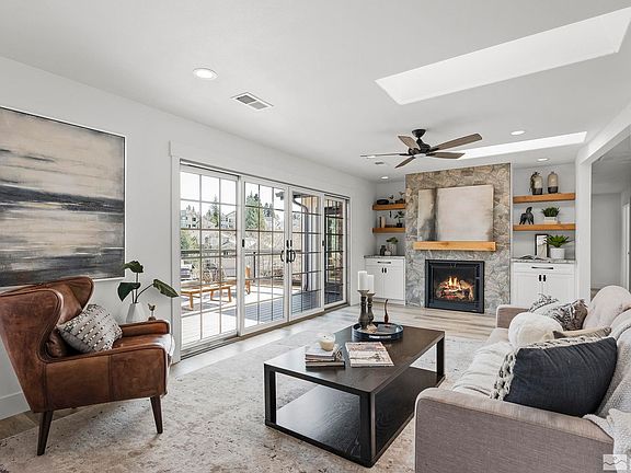 Classic Southwest Reno meets modern design in this stunning brick home. The 2023 comprehensive remodel showcases the latest high-end interior finishes, upgrades and systems. Inside the McCarran Loop, this home is close to dining, entertainment and shopping., The main floor primary bedroom with ensuite offers a walk-in shower, dramatic marble tile, dual sink vanity and large walk-in closet. The spacious kitchen boasts all the most desirable amenities: breakfast bar, white shaker cabinets; leathered granite counter tops; soft-close cabinets and pull-outs; large pantry cabinet: garbage cabinet; window over the sink; GE profile appliances; convection oven; gas range and under-cabinet lighting. The kitchen is open to living and dining room, with some separation. The living room features a wall of windows including two sliding doors to the Trex deck, a gas fireplace, attractive wood mantle and open shelves, built-in cabinets and skylight. A bracket and hook-up is awaiting your TV over the mantle. Formal dining area is enhanced by modern chandelier and glass doors to the covered portion of the second-story deck. Luxury vinyl floors in main living areas and upgraded carpet in the bedrooms, family room and game room. Two additional bedrooms and attractive guest bath complete the main floor. The walk-out basement offers an impressive wood-burning fireplace visible from both the family room and the game room. These two areas offer flexibility for your specific needs: media room, office, teen space, man cave or in-law quarters. There is a spacious second main bedroom guest suite downstairs that possesses a luxurious bathroom with shower. Completing the lower level are a big laundry room with cabinets, counter and sink; a stylish half-bath and 2-car garage. An EV charger is installed in the garage. New Trex covered and uncovered deck overlooks a large, flat backyard. Plenty of grass for outdoor fun with a stone patio just waiting for a fire pit. Serene fountain and pretty views of mature trees and ravine make a tranquil retreat from your day. See virtual tour links for video and additional photos.