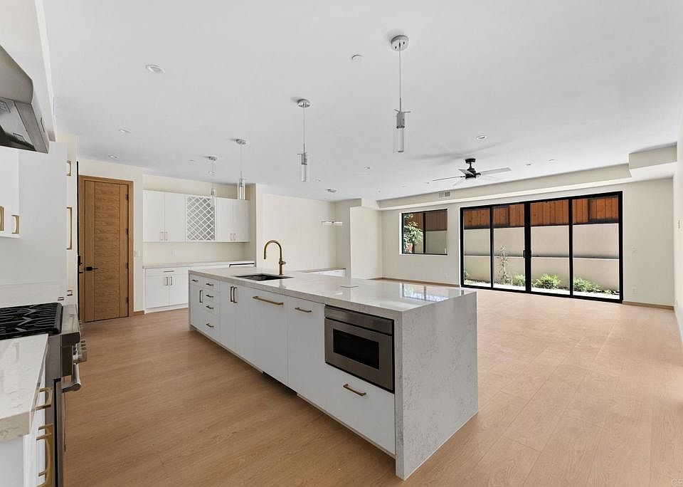 NEW CONSTRUCTION – Beautiful single-level (no stairs), first-floor unit at Roosevelt Nine Condos. Home features an open-concept true chef’s kitchen showcasing an oversized island, white custom European slab-style cabinets, Thermador appliances (fridge and dishwasher paneled to match), gold hardware, a Kohler touchless faucet, and a professional-grade Thermador hood vent. Corian Quartz counters, matching backsplash, and a dramatic waterfall island create a modern, high-end look. Dining area includes a large custom built-in seating bench with extra storage. Solid core doors from Urban Doors and matching wood baseboards run throughout, complemented by luxury motorized window treatments in bedrooms. Spacious primary suite offers a large sliding glass door opening to the private backyard and filling the room with natural light. Attached primary bathroom features designer tile, a custom glass shower enclosure, and a fully built-out walk-in closet. Located in the heart of Carlsbad Village, this home is a short stroll to countless dining options ranging from Michelin-rated restaurants like Jeune et Jolie and Lilo to casual favorites like Pure Taco and everything in between. The large, side-by-side attached garage (424 sf) will include epoxy flooring and custom storage cabinets, along with an EV outlet for car charging. Comes with owned solar. Unit is complete and power / gas are on. This an incredible opportunity to move into a highly upgraded brand-new home in one of Carlsbad’s most vibrant neighborhoods.