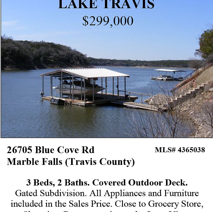 3/2 manufactured home on 1 acre with 65 feet of waterfront on Blue Cove at Lake Travis. Home is currently furnished. Large back deck overlooking Lake Travis. Large Boat Dock with Electric boat lift. Home is about 12 miles Northwest of Lago Vista or 24 miles Southeast of Marble Falls.
