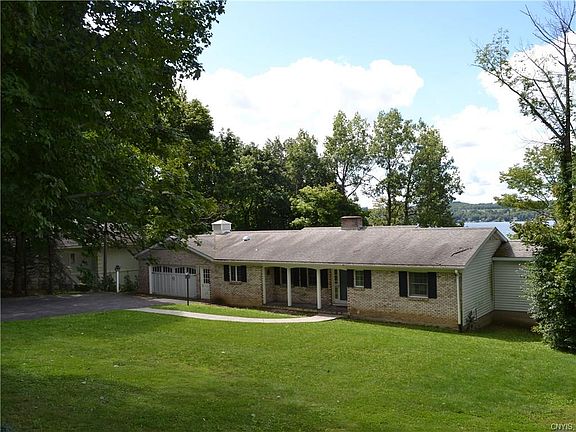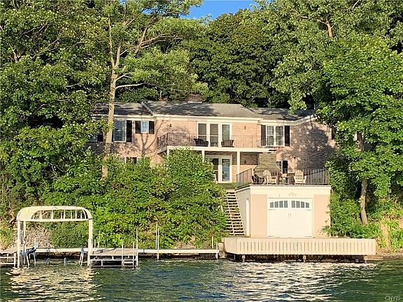 Enjoy spectacular sunsets from this spacious, east side, year-round ranch-style home. House features an open kitchen with sitting area and wood burning fireplace, formal dining and living room with French doors that lead to deck over looking the fantastic waterfront. Another fireplace completes the lower level finished walkout with 2nd set of French doors leading to the lake. 126 feet of private lake frontage includes a resurrected boathouse with interior fireplace that is loaded with potential for additional waterfront living space. In addition, there is a newly constructed permanent dock and upper sun deck with a large stone fireplace. This is a wonderful opportunity to enjoy Skaneateles Lake throughout all seasons.