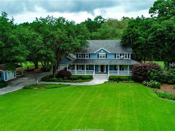 3 acres of live oaks & immaculately manicured lawn, this Lowcountry style home is full of southern charm & elegance. The spacious wrap around porch greets you as you enter this 4,307 sq. ft. home boasting 5 bedrooms, 4.5 baths plus an office, kid's study & bonus room. Interior features include beautiful hardwood floors, silestone countertops, wood burning fireplace & 1st floor master suite with steam shower. Attached & detached garages are perfect for the toys & tools. The local golf course is across the street and deep water access 10 minutes away. This impressive home offers space, privacy & no HOAs only 25 minutes from Bluffton/Beaufort.