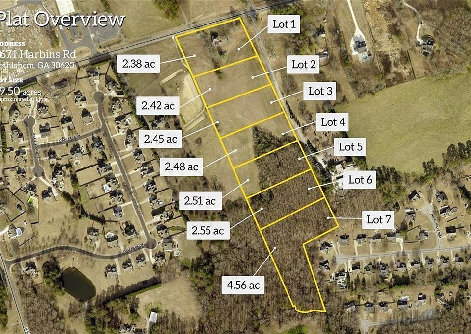 Outstanding Builder & Developer Opportunity in Gwinnett County! Situated along scenic Harbins Road, this 19.5-acre property offers seven expansive, fully platted estate lots ranging from 2.387 to 4.568 acres. The land features beautiful, gently sloping topography—perfect for custom homes. Located just minutes from Hwy 316 in a rapidly growing area, this site is surrounded by luxury homes priced between $1.4M and $1.8M on nearby Indian Shoals Road. A new middle school is coming soon, adding even more value to this in-demand corridor. Buyer will be responsible for installing the shared driveway, connecting utilities (water, electricity, septic), and removing the existing house currently on the property. A rare chance to build in one of the most sought-after growth areas in Gwinnett County!