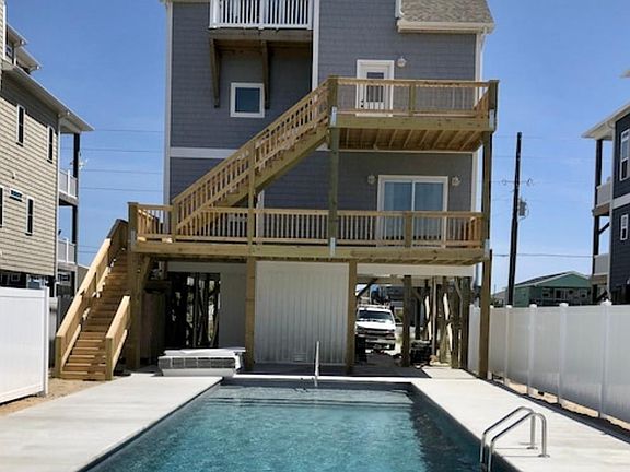 Beautiful custom designed fully furnished beach house on Topsail Island with a new in-ground 40 x 16 Latham pool that can be heated! Over 2300 Sqft, this newer built home boasts 4 Bedrooms 4.5 baths and is centered on an over-sized 0.23 Acre property, close to award-winning Topsail Beaches, Great shopping and Restaurants nearby. $100,000 gross revenue in 2021! Exterior materials have been selected for maximum protection. Features include CertainTeed 50 year Architectural Roof shingles, Standing Seem .032 Aluminum metal roof accent, Copper flashing on all decks, high quality Mastic Cedar Discovery 7-in Vinyl Shake Siding with white vinyl trim and white vinyl board and batten siding at piling level. The inclement weather entry invites you home to 4x24-in Tiled Plank floors, 6-in base boards, Ship lap trim, a ground level landing zone for the Model LE elevator cab, and Smart Vent foundation vents for added protection. Featuring spectacular views of the Topsail Island, the great room boasts 9 ft ceilings, recessed lighting, open air ceiling fan, accent wall with custom shiplap trim, luxury vinyl plank floors, 4 5/8-in Crown molding, and protected by Viwinco OceanView Series high impact windows. Outside the partially covered 34x10-ft decks with vinyl rails has abundant space for deck chairs and outdoor dining. The gourmet kitchen boasts granite counter tops, deep dual basin under counter sinks, white subway tile back splash, white wood cabinets with dove tailed joints and easy close drawers, an upgraded GE stainless steel appliances package includes 25 cubic inch side by side refrigerator, smooth top stove, built in microwave oven, and stainless steel efficient dishwasher. Just off the kitchen is a 2nd floor landing for the interior elevator.