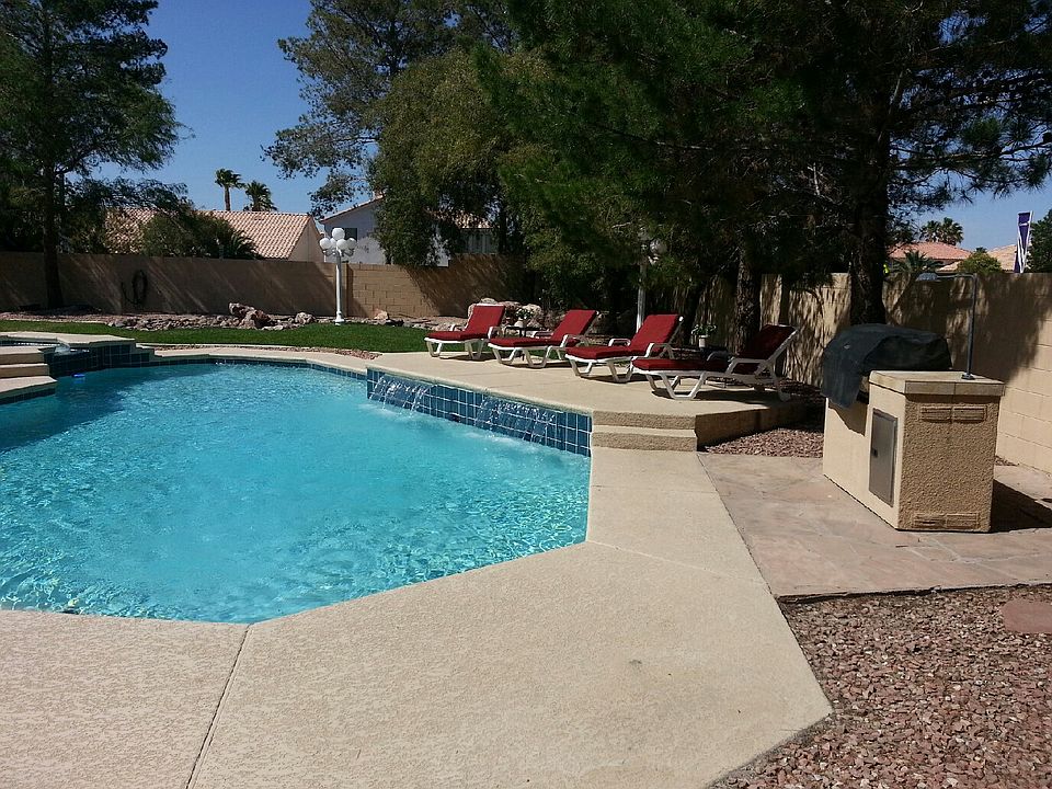 Beautiful pie-shaped lot with tremendously huge and gorgeous rear yard with pool, spa, B/I BBQ and full covered patio. 3 way fireplace in separate Family Room with Wet Bar & 2 way fireplace in Master. All tile down, new carpet up. 5 true bedrooms with ceiling fans and plantation shutters in all. This is a must see. (Pictures are worth a million words.) Landscape & Pool Service INCLUDED in Rent.