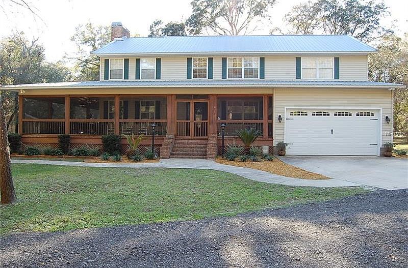 COME FALL IN LOVE!! This stately home is nestled on 2.5 wooded acres with a circular drive. Vaulted ceiling foyer entrance, 4 spacious bedrooms, and three full bathrooms with new tile. Kitchen features solid wood cabinets, new GRANITE counters, walk in pantry, peninsula and new GLASS SUBWAY TILE back splash, wide plank hardwood floors throughout main level and crown molding in living room. Cozy up by the brick gas FIREPLACE. Double french doors lead to the 806 sq foot wrap around SCREENED PORCH. Additional 400 sq feet of wooden deck entertainment space with BUILT IN FIRE PIT and seating, fully fenced back yard, mature landscaping and oak trees. Zoned agriculture so bring your horses! NEW gas furnaces in 2013, NEW AC units in 2012 & 2013, NEW metal roof in 2005, NEW well tank in 2016. Large pole barn offers great potential, approx 1200 sq feet & 1.5 baths with possibility of living quarters or home business space and plenty of space for RV, boat parking or horse stalls below (not included in total sq feet). Separate detached workshop with electric and metal roof. This home really has it all! Only a 2.5 mile drive to I-4 and just a 45 minute drive to Orlando area attractions!