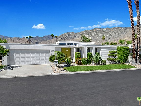 Be one of the lucky 44 to own a Mid Century property in South Palm Springs, Kings Point. William Krisel's vision when this was built in 1969 was called "International Modern". With high ceilings and and open floor plan, poured terrazzo flooring and walls of glass show how this vision stands the test of time. Three bedroom suites all positioned for privacy and large master suite with West and South mountain views and covered outdoor patio area. Just steps to the pool and spa (one of two for the complex) reveals dead on South and West views from the gallery area of the home with central gas fire place anchoring the space. The kitchen has a eat in area with extra storage and side by side laundry.
