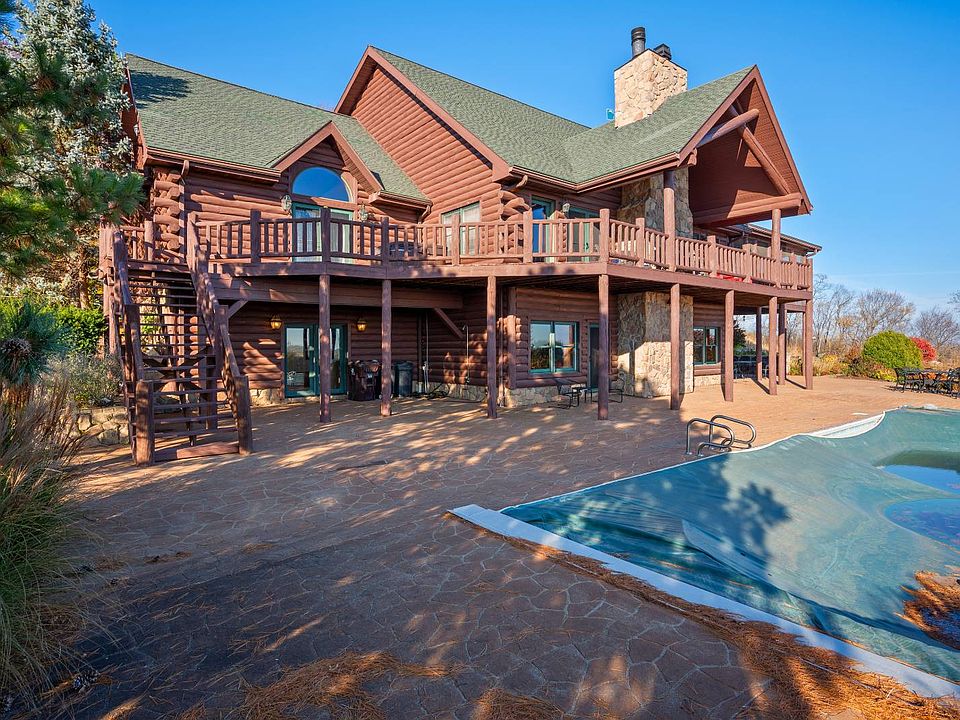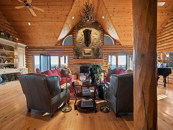 Built to captivate and entertain, this extraordinary estate offers the most breathtaking vistas in Fulton County, Illinois: a magnificent 7,000 Sq Ft custom-built log home, complemented by a detached two-car garage, perched atop your private 343± acres overlooking the serene Illinois River. Crafted from pristine white pine, this three-level masterpiece boasts five luxurious bedrooms and 3.5 baths, with all furnishings, bespoke shelving, and media consoles thoughtfully included. Step through the grand front door onto gleaming oak floors that flow throughout the main areas, while plush carpeting graces the bedrooms and elegant tile adorns the bathrooms. The gourmet kitchen is a chef's dream, featuring premium Jenn-Air and GE appliances, custom cabinetry, a stately 10-person dining table, a six-stool breakfast bar, and an intimate two-chair nook. Adjacent, a spacious walk-out screened porch-measuring 25.6ft x 13.6 feet invites al fresco relaxation amid nature's symphony. The expansive great room, anchored by a majestic stone fireplace and soaring vaulted ceilings, bathes in natural light, perfect for intimate gatherings or quiet reflection. Custom built-in shelving adds sophistication, while French doors lead to an open-air deck spanning the home's full length, commanding panoramic views of the estate's verdant expanse. At the far end of the main level, the opulent primary suite reigns supreme: a sprawling 29ft x 22.6ft sanctuary with vaulted ceilings, dual walk-in closets crowned by a private loft, and a balcony for sunrise reveries. An integrated office nook and cozy reading alcove enhance its allure, while the en-suite bath indulges with his-and-hers vanities, a rejuvenating Jacuzzi tub, separate shower, granite countertops, and tiled floors. Step outside to a newly installed hot tub and descending stairs to the lower level. Ascend to the upper floor, where two generous bedrooms share a Jack-and-Jill bathroom with tiled floors and countertops, fostering both privacy and convenience. Descend to the walk-out lower level, a haven of leisure featuring a vast den with another grand fireplace and an impressive custom entertainment center (15 feet wide by 8 feet tall). A full secondary kitchen, expansive laundry room, and lavish bathroom-complete with an infrared sauna-await, alongside two additional bedrooms. Radiant floor heating envelops the main and lower levels in cozy warmth during winter months. A dedicated utility room houses the water heater, heating system, furnace, and ample storage, while a secure storm shelter and versatile storage space (potentially convertible to another bedroom) provide peace of mind. This level opens to a meticulously manicured patio and a sparkling 20-by-40-foot pool, ideal for sun-drenched afternoons. Designed for unparalleled entertaining, this residence exudes grandeur with its open-concept spaces, expansive decks, inviting pool, and unrivaled overlooks of the rolling landscape. The western parcel spans 117± acres, including 14 tillable acres, a stunning 6-acre lake, and two smaller stocked ponds teeming with life. The bluffside timber-rich with hardwoods and pines-offers world-class deer hunting amid a tapestry of natural beauty. Enhancing the estate are a charming three-bedroom caretaker's home with a wrap-around deck, a 25-by-45-foot concrete-floored shed featuring a heated hunting clubhouse at one end, and two additional outbuildings. Contact the Legacy Land Company listing agent to learn more about the waterfowl and deer hunting and remaining acreage. Conveniently located just 20 minutes from Peoria International Airport, with effortless access to major hubs: Chicago (3-hour drive), Springfield (1-hour drive), St. Louis (2.5-hour drive), and Nashville, TN (6.5-hour drive). Priced at $3,800,000. For inquiries about this exquisite home, outbuildings, and acreage, contact the Legacy Land Company listing agent