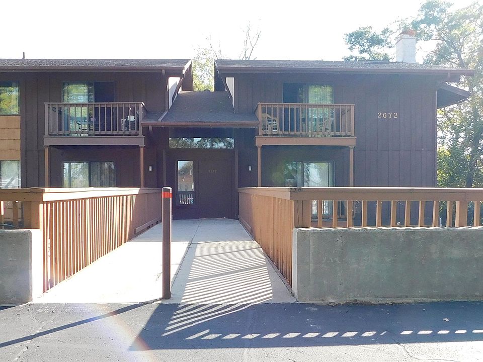 Welcome to Three Bridges North! This cozy condo features vaulted ceilings, fresh paint throughout, new light fixtures, new dishwasher, microwave, and bedroom carpet. Spacious living room leading to the newly painted deck overlooking the beautiful wooded ravine. Cozy and comfortable den featuring a newly updated fireplace. Carport parking below unit as well as laundry. Amenities include large deck with gazebo, grassy grounds, and in-ground heated pool. Condo dues include heat, water, snow removal and lawn care for your convenience. Enjoy condo living! 48 hours binding acceptance.