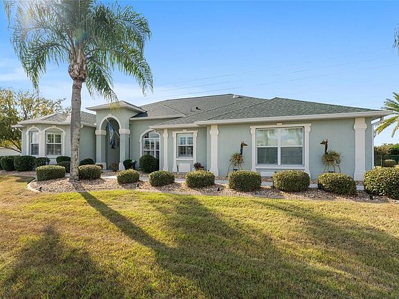 Welcome Home to Ocala Palms 55+ golf community! Find sanctuary in one of Ocala Palm’s most sought after fenced-in ½ acre lots. This gorgeous home offers the largest layout of the community; complete with pool and all the upgrades you could desire! This 3-bedroom, 2 bath home features hardwood flooring throughout, estate shutters, crown-molding, ceiling fans in every room and best of all WIFI accessible thermostat. Enjoy your gourmet kitchen that has updated cabinets with pull out drawers, a swing out pantry and quartz countertops. The Over-sized master suite is perfectly built with his and hers designer walk-in closets, a spa inspired bathroom with double vanities, walk-in shower and garden tub. This split floor plan offers two guest rooms complete with a handicap accessible shower in the nearby bathroom (complete with pool access) as well as recessed alcoves in each that are great for extra storage. Walk through the large living room with tray ceiling and enjoy the back yard view of the newly updated lanai (2022). Get ready to entertain family and friends on the lanai with your summer kitchen with upgraded sunshade, brand new waterfall, pool cage with lights and hard-wired Bluetooth accessible outdoor speakers. The pool is salt-water, solar heated and controlled with a Pentair wireless accessible pool-system and don’t forget to relax and unwind in the heated Jacuzzi. This home has Kinetico Mach series water softener that is maintained yearly, a new roof (2023) and lanai screen (2023). The A/C is from 2015 and is serviced yearly. The community hosts an 18-hole golf course, fitness center, indoor pool, arts and crafts studio, card room, multi-purpose room, sewing studio, billiards room, table tennis, and a library that provide plenty of space for recreation, relaxation and activities all just a golf cart ride away. Residents can also stay active outdoors with the outdoor pool, tennis, bocce ball and shuffleboard, and soon to be built pickle ball courts. Don't forget to check out the community's locally owned Bella Cosa Italian Ristorante. This home is perfectly located across from Publix grocery, restaurants, gym and local shopping. Only 3 miles from the World Equestrian Center and minutes to downtown Ocala.