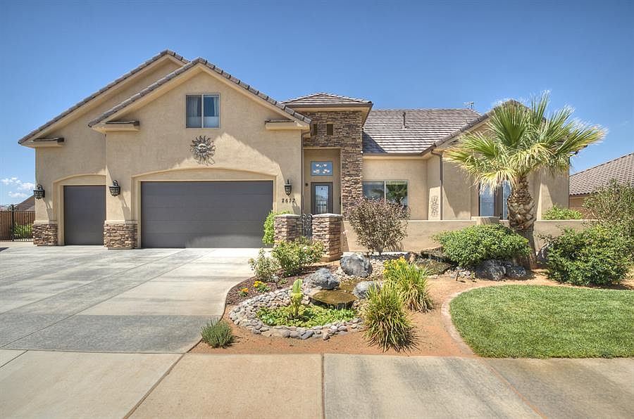 This exceptional 2011 Mediterranean Parade Home is truly a must see! The landscaping is exquisite. The hone features include: single and French iron doors, premium exterior house lighting, designer granite counter tops, gas fireplace in family room & master bedroom, double shower in master bath, 10' ceilings on lower floor, in house vac system, tinted double pane windows, glass block, ceiling fans in all rooms, custom premium wall glaze with 8" high baseboards in knotty alder including woodwork built-ins, 2x6 energy efficient construction, extensive designer travertine and onyx stonework, hardwired CAT 5e throughout, glass tile water fall & heated swimming pool, pond with waterfall, lighted pool shed & pump house, sprinkler system & hard wired garden lighting front and back, detached garage / cabana with split system and iron doors. HVAC, storage closet, roll up garage and additional iron french doors on the side facing beautiful landscaping and swimming pool. Excellent home for family and or entertaining. This home exudes elegance and class in a very inviting and livable package. Brokered And Advertised By: EQUITY REAL ESTATE (ST GEORGE) Listing Agent: Scott Dutton