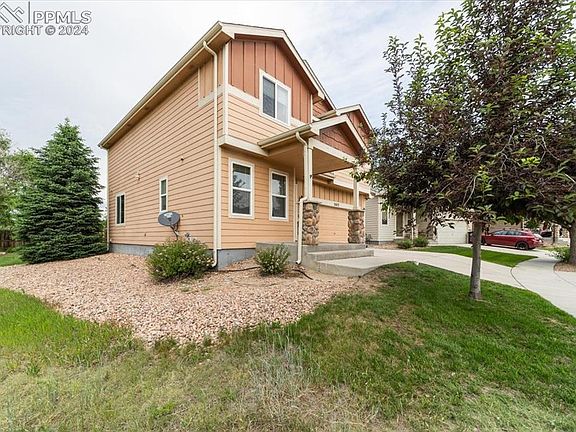 Inviting, 2-story home offering a perfect blend of style & convenience. With 4BRs, 3BAs, & a 2-car attached garage, this home has a great floor plan w/ comfortable living spaces. Central air & heat for year round comfort. Step inside to discover attractive wood laminate floor that grace the Entry, Din Area, & Kitchen creating a warm & welcoming atmosphere. There is a versatile room off the Entry w/neutral carpet & front yard views that you could use for an Office or Sitting Room, along w/ a convenient Powder Bathroom. Continuing through the Entry you'll find stairs to the UL & under stair storage. The spacious Living Rm is open to the Dining Room and Kitchen. Natural light streams in through the windows, creating a light and bright ambiance. This Living Room seamlessly flows into the Dining Area and Kitchen. The Butcher Block Island Kitchen boasts a pantry and white cabinets w/ quartz-like countertops that elevate the space. Stainless steel appliances include a double sink, smooth-top range oven, built-in microwave, dishwasher, and side by side refrigerator. A slider from the Kitchen/Dining Area leads to the backyard, perfect for indoor-outdoor living and entertaining. Upstairs hosts 4BRs w/neutral carpet, 2BAs, and the Laundry Rm. The Primary Bedroom is a private retreat that offers a walk-in closet and 5pc Bathroom w/ a dual sink vanity, soaking tub, and separate shower. 3 more BRs (1 w/ a walk in closet) share a Full Bathroom w/ vanity, mirror, and tiled tub/shower. The Laundry Rm provides an LG front load washer and dryer that stay. The backyard has auto sprinklers & provides a concrete patio for outdoor dining & relaxation. Lawn maintenance is provided by the HOA and is included in the monthly dues. Conveniently located close to schools and parks w/ an easy commute to I-25 and all military bases. Don’t miss the opportunity to make this move-in ready home your own where you and your family can live comfortably making cherished memories for years to come.