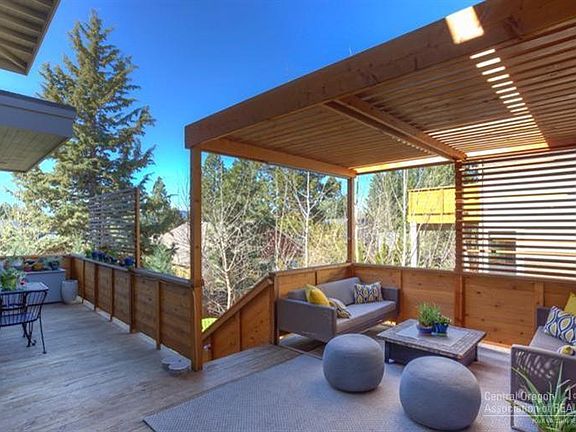 Open the door of this contemporary home & find 12'ceilings, open floor plan, main level master ste, abundance of natural light w/2-sliding French patio doors that open up to a private deck & courtyard, giving you the amazing feel of a combined indoor/outdoor living. Enjoy views of Mt. Bachelor from both levels of the home & quiet dinners on the covered side deck. Come out & see all the wonderful living spaces this home has to offer. Open House Sat. & Sun. 11-3p