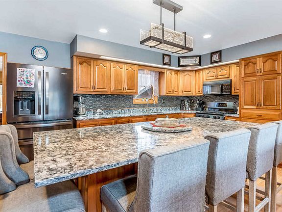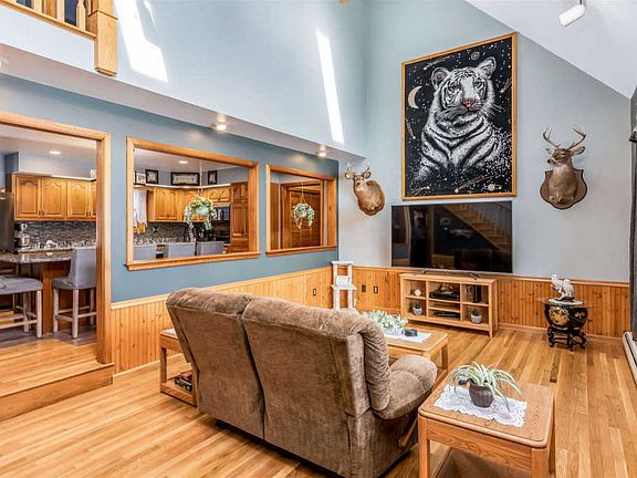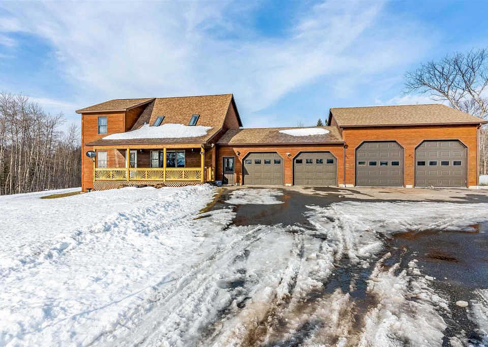 Whether you love cars, equipment, tools or pretty much anything in between, this is the home for you! Set out in an idyllic country setting with over nine acres of land, this home covers all of your garage and storage needs and more! The massive 4-car garage features two ten foot doors, a car lift and a compressor. The taller side is finished and heated, making it the ideal spot for the wife to get mad at you for spending all your time. Behind the main garage is the perfect place for your snowmobiles, ATV's and other fun toys. Inside the home youâll enjoy amazing features like the beautiful recently refinished hardwood floors, vaulted ceilings in the large and sunny living room with skylights that allow all of the natural light to flow in. The eat-in kitchen offers tons of cabinet space and the gigantic island is the perfect spot to gather around with family and maybe one day friends. On the back of the house you'll find a lovely four season porch with natural wood and plenty of windows. One bedroom, a full bathroom and the laundry area complete the first floor and upstairs you'll find two generously sized bedrooms along with the master bedroom as well as the second full bathroom with separate tub and shower. The basement is prime unfinished space and houses all the updated utilities including the power storage system for the owned solar panels outside, making it a greener and more affordable option too. If you want privacy, seclusion and love a big garage, this is your spot!