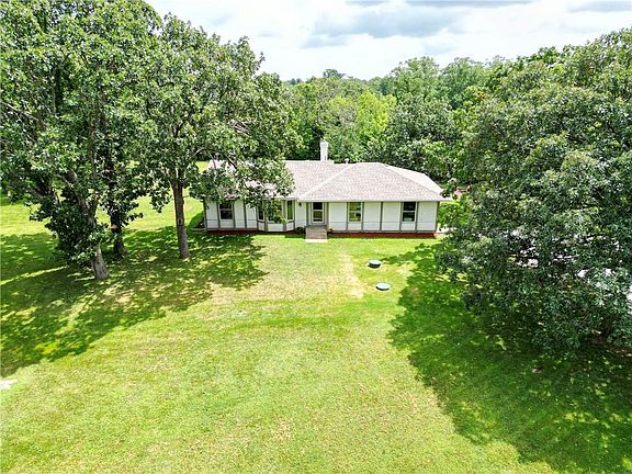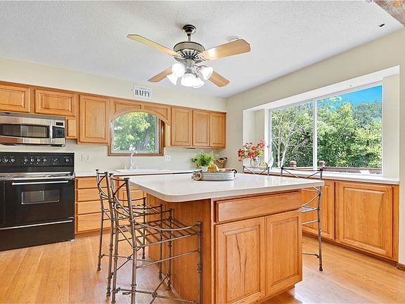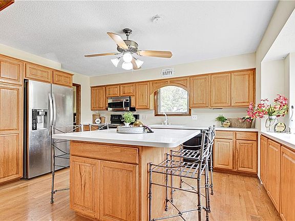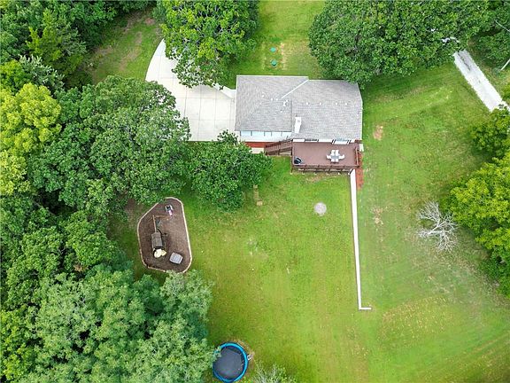 PRIVATE and SERENE! WELL MAINTAINED RANCH ON ALMOST 3 ACRES! Tranquil oasis within the city! Wooded, level lot with plenty of space in the front and back of the home. This light and bright home features a newer stained kitchen cabinets, huge island, and tons of windows overlooking the acreage. Kitchen hardwood floors and cozy brick fireplace with wood stove that will heat the whole house. Slider off the kitchen leads to new stained deck that overlooks the acreage. Spacious dining room with hardwood floors and large living room with neutral decor. Hardwood flooring leads to bedrooms as well. Primary bedroom with its own bath, hardwood floors and closet. Two additional bedrooms and full hallway bath. Two car garage is extra deep. Basement has huge potential for more living space, add another bedroom, bath and family room. You will love the walk out slider and second fireplace too. Basement would be easy to finish. Head outside to playground that stays and plenty of space to explore. Dead end street so safe and quiet! Award winning DeSoto School District. Minutes from, beautiful parks, schools, shopping and highways!!