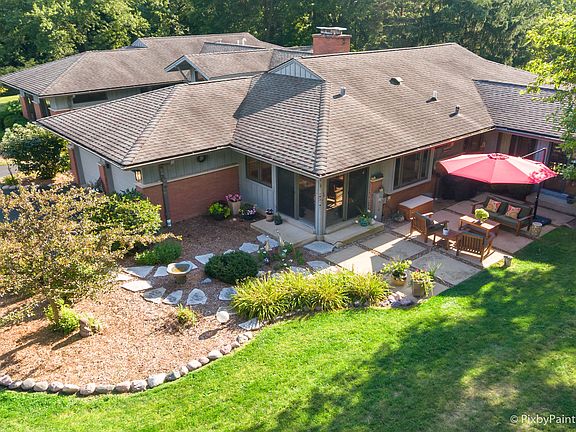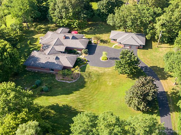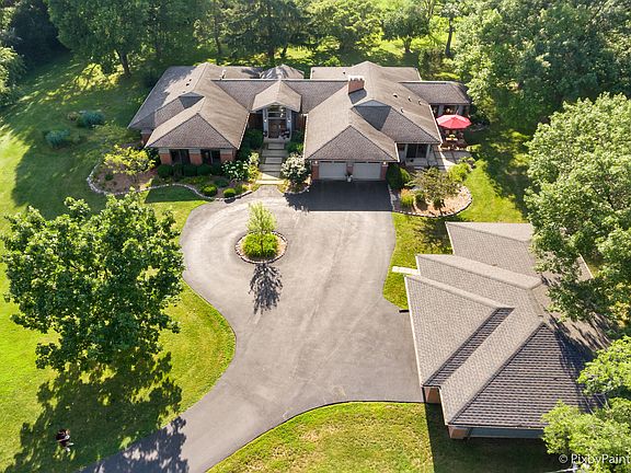 Winding drive leads to this gorgeous light & bright contemporary ranch. Great home for entertaining with open floor plan including vaulted beam ceilings and hardwood flooring plus multitude of windows & sliding doors bringing the outdside in! Spacious custom Kitchen has bar, 42" cabinetry, granite, stainless & cozy breakfast booth. 14x20ft formal Dining Room is surrounded by windows. Master suite has Lg walk-in and luxury Bath with 2 vanities, jacuzzi & dual shower. 4 additional generous sized bedrooms, most with walk-in closets. Finished basement has ext access, hardwood flooring and 1/2 bath. Private 5 acre sanctuary with mature trees and prairie views. Backup generator and Kat5 wiring. Tandem 3C att Gar, plus 1308sf detached heated building with 220V, could be used as additional 6 Car Gar or currently used as workshop. Plus 400sf 2nd outbuilding/shed. Newer: Interior drain tiles, finished bsmnt, paved driveway, sump, water heaters, water filtration, 1300sf outbuilding & much more!