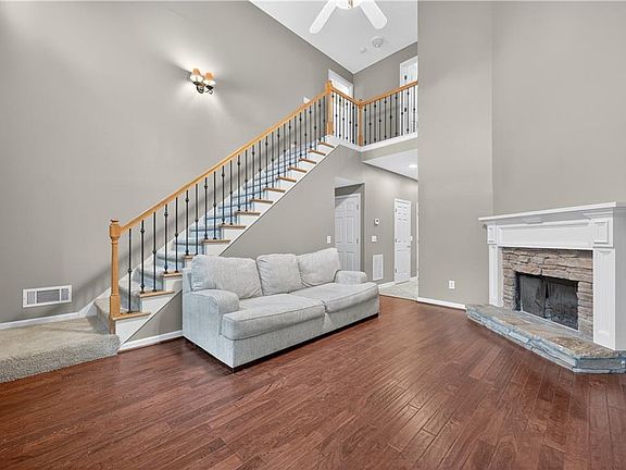Stacked stone fireplaceBackyard patioStainless appliancesEn suite bathSeparate showerKitchen islandPrimary bedroom