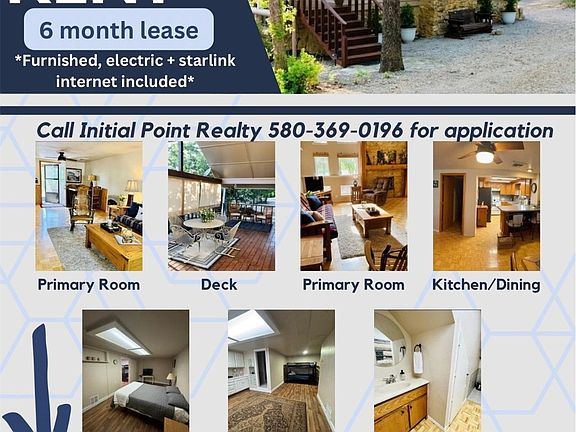 Check out this furnished rental near Arbuckle Lake between Sulphur and Davis, Ok. One year lease, $1600 deposit, $1600 per month, tenant pays their own utilities - water, trash, and electric. The property owner will consider a short term or mid-term lease at an increased rental rate.