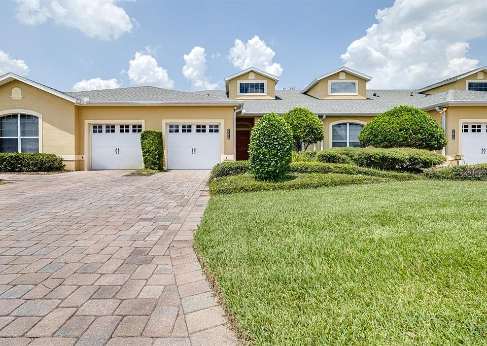 Welcome home to this wonderful 2-bedroom, 2-bathroom, 1-car garage, single-story townhome with a bonus room/office in the well-maintained lakefront community of The Verandahs of Lake Reeves! You'll approach the home from the elegant pavered driveway and walkway. Upon entering the home, you'll immediately be struck by the tall vaulted ceilings (approx. 18 ft. tall), along with the natural light shining in from the high window above. The kitchen, dining, and living rooms are combined with an open-concept floorplan making it perfect for entertaining. The kitchen features solid corian countertops, tile flooring, a breakfast bar, and a full suite of appliances (including a recently replaced disposal and faucet), along with two sizeable pantries. The laundry room is located between the kitchen and the 1-car garage. The spacious living room/dining room combo features dark laminate flooring which leads out to the covered and screened-in back porch just beyond the sliding glass doors. The two bedrooms are arranged in a split floorplan configuration where they are separated by the bonus room/office which can be closed off using its dual pocket doors. The master bedroom offers ample space for a king-size bed and features a huge walk-in closet and an ensuite bathroom. The master bathroom is home to dual sinks and an oversized shower. For privacy, the second bedroom offers direct access to the second bathroom through its own door, while the bathroom is also accessible by the rest of the home via a hallway door. The low monthly HOA fee of $200.00 includes grounds maintenance, common area maintenance, pool, dock, basic cable, internet, and exterior painting every few years. All roofs in the community were replaced after Hurricane Irma in 2018. The community's well-maintained pool and lakefront dock are only a stone's throw away from this home's front door. As added peace of mind, the community is located near the local fire and police stations. The community is also located close to shopping and entertainment options, with several more options popping up. The community is also just a 10-minute drive to Legoland - even the evening fireworks displays are visible from the property. Call today for your private showing while this fabulous home is still available!