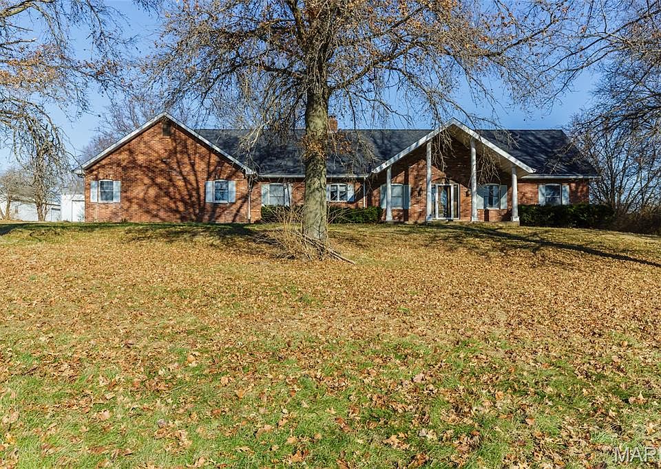 Take advantage of this rare opportunity to get a full-brick ranch home on 5 Acres with a Massive Barn! Discover the potential of country living just minutes from O'Fallon and with good I-70 access (via Guthrie/Fremuth Rd to LSL exit). This spacious 2,358 sqft full-brick ranch offers a wonderful rural setting and an incredible amount of space, ready for your vision. The main floor boasts an impressive layout for entertaining: a hardwood entry foyer leading to a formal dining room, and a truly stunning sunken great room featuring a soaring ceiling, a massive bay window, and an unbelievable floor-to-ceiling stone fireplace topped with a skylight. The large chef's kitchen features a center island, hard-surface countertops, ample cabinet space, a pantry, and a breakfast area. The primary bedroom suite is a private retreat with French doors to the rear patio and an en-suite bath complete with a jacuzzi tub, separate shower, his-and-her closets, and a skylight. The main floor also includes a large laundry room and a half bath off the oversized 3-car side-entry garage. Finally, the lower level is partially finished with a family room, a second wood-burning fireplace, a full bath, a kitchenette, and an office/potential 4th bedroom. Hobbyists will love the dedicated staircase from the basement leading directly up to the oversized three-car garage. The seller recently put a new roof on the home and professionally remediated a mold issue discovered when the personal property was taken away. Outside, the property truly shines with 5 picturesque acres and a massive 48x43 metal barn with a 15x48 lean-to—perfect for storage, workshops, or animals. This home requires updating and repair to restore its shine, but the potential to build equity and create your dream estate is unmatched. The seller is intending to sell the home "As-is, Where-is", but does encourage inspections so you can gauge the amount of repair needed. Come see how a little work can secure this extraordinary property!