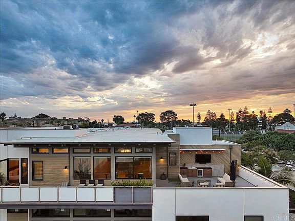 Enjoy the views & a peek of the Ocean from this private single level Condo! Located on the Top floor with over 1,000 sq ft of Patio Area, plus semi private elevator and Main entrance has a 9-foot African Mahogany front door. Patio counter area includes Big Screen TV, sink, Refrigerator, storage area and more. And Great Views. Open the sliding Wall of Windows from the Great Room onto the Patio. Condo features 12-foot ceilings with exposed beams, Fire Sprinkler System and large windows with remote-controlled shades. Herringbone white oak floors in the Great Room & Kitchen area, with white oak floors throughout. European-style kitchen has a large island with an Insta Hot & Cold faucet, hidden DACOR Refrigerator and Freezer, Commercial-grade Dacor Dishwasher, Dacor stovetop & oven, soft close drawers, and more. The adjacent Laundry Room adds convenience. Floating wood shelves line the hallway. Two Master Bedrooms, each with their own bathroom. Walk-in Bedroom closets are oversized, with air vents, and may accommodate a hidden desk or additional storage. Front Master Bedroom accesses the outside patio. Secured Garage features 2 assigned parking spaces and a private secured storage area. Located in the heart of Carlsbad Village. Walking distance to 4 & 5 Star award-winning restaurants, charming cafés, boutique shopping, farmers markets, wine bars, and the sparkling Pacific Ocean. Whether starting your morning with a beachside stroll or ending your evening on the rooftop patio, everything you desire is within walking distance.