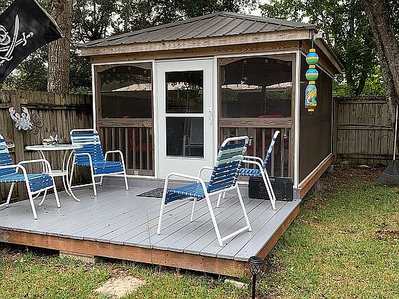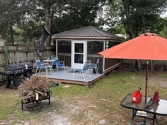 If you are looking for a beach getaway this is it completely remodeled can sleep 4 .Outdoor living includes a large pavilion for your cookout completely screened in also large lofted out building. A golf cart ride to grocery store, drug store, ice cream shops and restaurants a5 minute drive to beach.