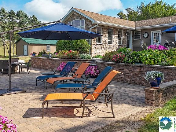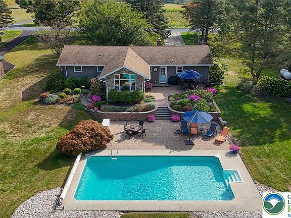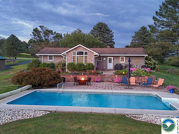MULTIPLE OFFERS RECEIVED. Seller has called for Highest and Best by Monday 9/15 @ 5 PM. Amidst rolling hills and farms, this charming ranch offers updates throughout and an unmatched backyard. A concrete drive sits in the thoughtfully landscaped front yard. A front porch welcomes you via the formal dining room, a gas fireplace and bow window add style and substance! The kitchen is bright and spacious, every inch updated for ample work and storage with beautiful finishes. A living room added in 2014 soars with 11’ peak cathedral ceilings, hardwoods, second gas fireplace and glorious views. Three lovely beds offer warm wood doors and hardwoods adding luxurious rustic charm. Updated hall bath features attractive vanity w/vessel sink, ceramic tile wainscoting/shower surround, and heated ceramic tile floor! Main-level laundry/mud room with second new full bath offers garage and patio access. Lower level: a nearly 400sf finished family room pairs with 450sf unfinished utility/storage room! Backyard oasis: two tiers of paver patio totaling over 1100sf overlook the 18x36 inground saltwater pool, a panorama of bucolic bliss surrounds. LEDs illuminate the stone steps connecting levels, meticulously designed and maintained planting beds surround. Beyond outdoor amenities a detached garage offers 560sf of space to house an additional vehicle and every item you need to maintain these exquisite grounds, asphalt driveway connects to street.