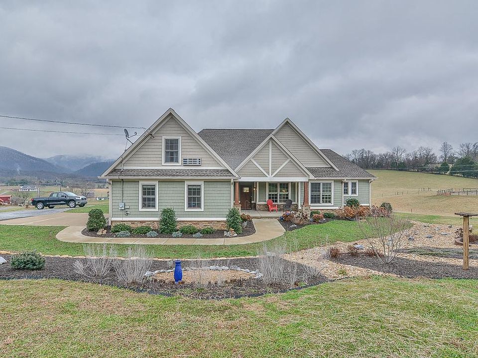 This beautiful 3-4 bedroom, 2 full bath Craftsman style home sits on 5 acres of land with amazing views of the mountains. Most of this home is on the main level, with the exception of a bonus room located above the garage. This room could be used as a fourth bedroom, with extra storage located through a doorway at the back of the closet. There is also an additional room on the main level that could be used as an office, or if you put a door in, could be an additional small bedroom. The home features a stone double-sided fireplace, granite countertops, and stainless steel appliances. The exterior of the home is vinyl shingle and features beautiful cedar framework. There is a barn on the property that currently houses mini horses and has electricity running out to it. Please call today to schedule a private showing.