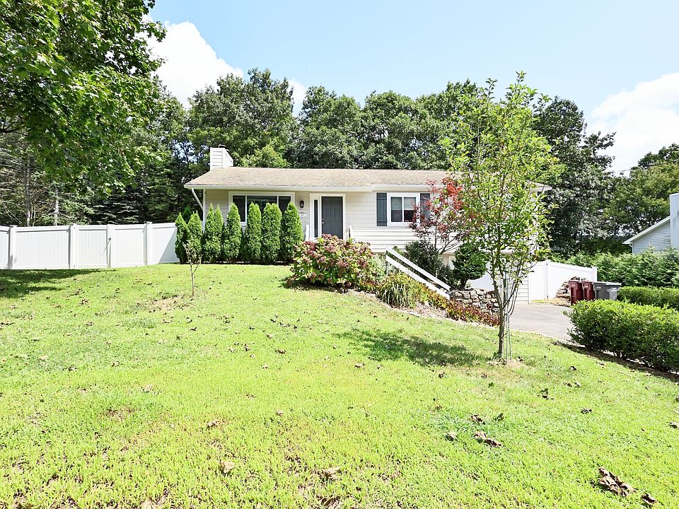 Welcome to this beautifully crafted ranch home, nestled in a tranquil neighborhood. This residence features rich dark wood flooring, elegant crown molding, and recessed lighting throughout. The main living area boasts a stunning feature wall, a stone fireplace, and a vaulted ceiling, seamlessly connecting to the dining area. Step through the glass slider to the back deck, where you can enjoy views of the expansive, fully fenced backyard complete with a playscape and storage shed. The kitchen is a chef's dream, offering white shaker cabinets, stainless steel appliances, and granite countertops. Down the wainscoted hallway, you'll find ample storage, three generously sized bedrooms, and a full bathroom with double vanity sinks. The finished basement provides additional living space, perfect for gatherings, a playroom, or a home office, with convenient walkout access to a covered outdoor patio. Additional amenities include extra storage space, a sauna, a shared half bath, and a laundry area with direct access to the one-car garage. With easy access to highways, schools, shopping, and other conveniences, this move-in-ready home is a rare find. Don't miss your opportunity to see this home!