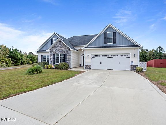 Nestled in a quiet cul de sac in the highly coveted neighborhood of Nautical Reach, this immaculate 3 bedroom, 2 bath with a bonus will not disappoint. Pulling up you will notice the manicured yard and beautiful garden. Step inside to be welcomed by high ceilings and stunning flooring. The living room is the perfect space for large family gatherings this holiday season. The kitchen is off the living room and opens to the dining area, where you have a beautiful view of the very private backyard. Enjoy a split floor plan, with the primary bedroom being to the right of the living area. The primary bathroom has a standing shower and a large space to make your own--perfect for a makeup vanity! The 2 large bedrooms are tucked away off the kitchen, as well as another full bathroom. Upstairs there is a bonus room. This is the perfect space for a playroom or home office! This home has new carpet, fresh paint, the garage and screened in porch is epoxy, as well as the driveway and walkway. Enjoy the North Carolina sunsets from your screened in porch. The backyard is large with a shed that conveys and a vegetable garden. Nautical Reach is conveniently located near Camp Lejeune, Stone Bay, MCAS New River, is close to the beach and is outside city limits. Schedule your showing today!