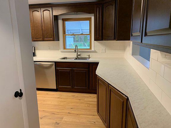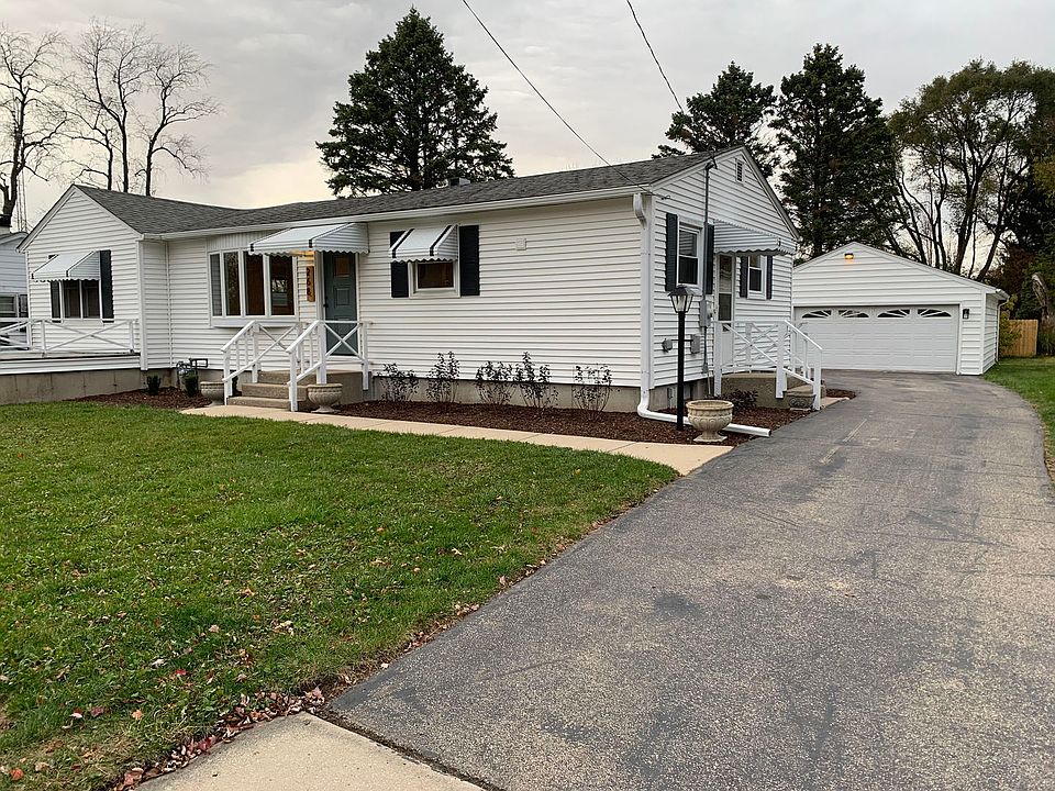 Updated 3 Bedroom Ranch Home with large 16x14 Primary Bedroom, Large Living Room and Dining Combo, Custom kitchen features plenty of cabinet storage New Counters and New Appliances, New Flooring throughout home, Fresh updated bathroom with new vanity. Walkout basement offers potential as both future living space and currently has attached garage/storage area with garage door. Large 672 sq ft detached 2 and half car garage. Large yard and patio. Elementary and Middle school within 1 block. Village has stated driveway to attached extra garage may be reconnected to street. Sold As-Is