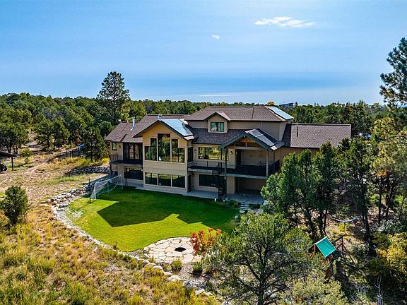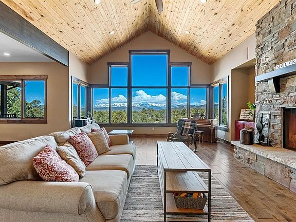 If you are seeking both luxury and function with breathtaking views, look no further than 268 Legacy Ranch Lane. Situated on just over 10 usable acres, this is an incredible sanctuary to enjoy everything Durango and Southwest Colorado has to offer. The quality of design and finishes in this home create an interior that is just as gorgeous as the setting. You’ll experience this right away as you walk in the front door and see the dramatic combination of warm wood finishes, tongue and groove ceilings, and huge picture window showcasing the magnificent La Plata Mountains. The great room is the perfect spot for gathering, entertaining, or just relaxing and taking in the scenery. The kitchen is fully outfitted with a Thermador gas cooktop with a warming rack above, a double oven, tons of counter and cabinet space, and a huge pantry to store all your culinary essentials. The main level primary suite is also designed to maximize views from the large bedroom and has private access to the deck, a spa-like bathroom with a double-sided fireplace, huge jetted soaking tub with its own window to indulge in the stunning sunsets, double vanity, and beautiful tile work in the spacious shower. With 3 ensuite bedrooms, as well as an office and media room, there's plenty of space for everyone to enjoy. Two of the ensuite bedrooms are upstairs, and there is one downstairs adjacent to the extra living space with a wet bar. The lower level grants access to the back yard - a perfect spot for gathering around the fire pit. Additional amenities include: an oversized 2-car garage with new garage doors, a newly paved asphalt driveway with extra parking space; a strong well with a 1000-gallon cistern; RV parking with water and electric hookup; two hot water heaters and two separate furnaces, a separate shed/storage room with a covered parking space for your toys; and a fully enclosed dog run. This property offers an unparalleled blend of opulence, practicality, and breathtaking scenery, making it a standout retreat in the heart of Durango's stunning landscape.