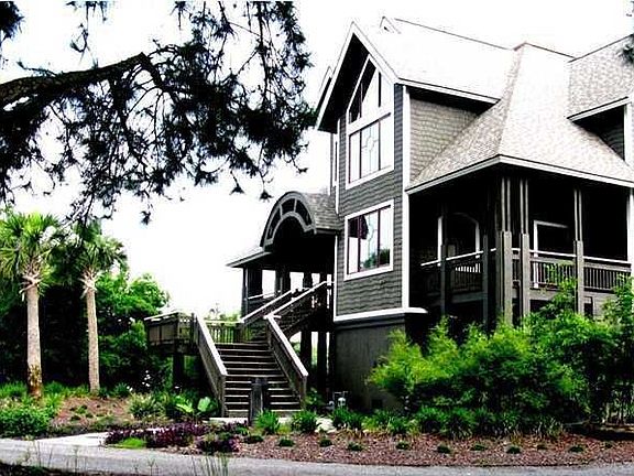 Folly Beach Private gated island, water views all around the home. Tidal Creek out to deep water and a lagoon in the front yard. Walk to the beach and 20 minutes to downtown Charleston. Features include 34 foot ceilings in the main living area with full length fireplace leads to open kitchen with breakfast/bar. Granite countertops in kitchen, two dishwasher drawers, two ovens, gas cooktop and stainless hood, icemaker and built-in-glass cabinets. Separate dining room offers two glass walled views of creek with one wall mirrored for echoed scene. Dual master downstairs (now used as study) has separate covered porch, bath with dual sinks in sequatchie stone countertop and garden tub/shower with view of lagoon. Upstairs master has deep Turtleback ceiling, two walk-in closets, coffee/tea station. Three car garage and/or boat storage. This home is centered around lifestyle. It's a must see.