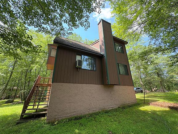 BACK ON MARKET DUE TO BUYER DEFAULT! Three Level Chalet Home awaits New owner! Amazing opportunity to Own your Own Mountain Gateway or Starter Home under 200K in Middle Smithfield Township, with a little TLC it will be like new! Main floor features Kitchen w/ Dining Area, Large Cathedral Ceiling Living Room and spacious Powder Room, Upstairs boasts 3 Bedrooms and Large Full Bathroom. Must see Full Basement w/Workshop and Pellet Stove and Outside Entrance. Located on Lovely Wooded, Flat Property in Low Dues Community.