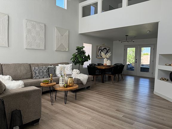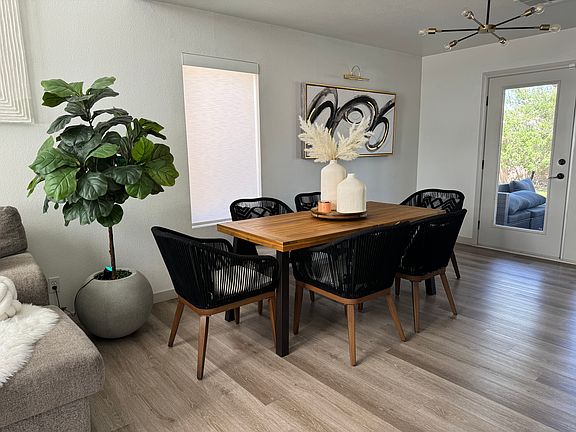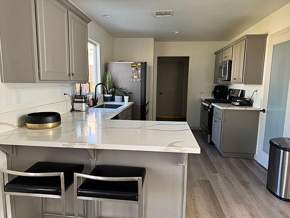 This stunning newly remodeled home is situated in a location. The interior features modern and stylish ambiance throughout. Downstairs, you'll find luxurious vinyl plank flooring that adds both beauty and durability. The kitchen is a true highlight, boasting quartz slab countertops, complementing the brand new stainless steel GE appliances and Bespoke fridge. The undermount stainless steel sink and hardware add a touch of elegance, while the convenient walk-in pantry with shelves offers ample storage space. The primary bath features a spacious walk-in shower with a custom tile surround, adding a touch of luxury. Designer bathroom vanities can be found throughout the home, adding both style and functionality. New light fixtures and ceiling fans have been installed throughout. The vaulted living room ceiling adds an airy and spacious feel, while the French doors lead to the backyard, providing easy access to outdoor enjoyment, the perfect space for relaxation and entertaining. Renter is responsible for power, gas, cable. Minimum Lease 1 Year