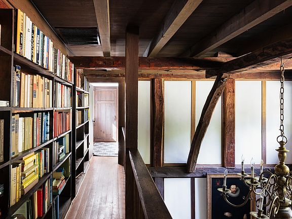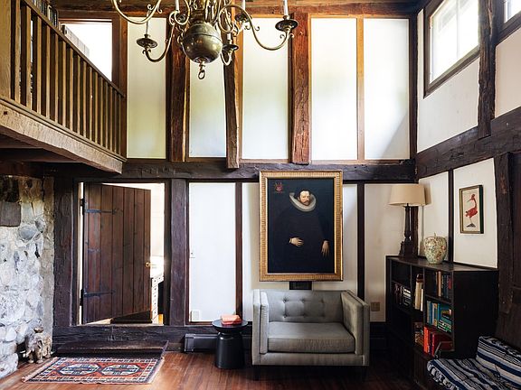 A historically significant Tudor that was once part of the Byrdcliffe Artist’s Colony, 2680 Glasco Turnpike sits perched atop a rocky bluff, surrounded by the pristine and forever-wild woodlands of Mount Guardian. Listed for sale for the first time in over 60 years, this property is a quintessential Woodstock retreat, complete with a pool, tennis court and guest-house. Enjoying absolute seclusion, this home is perfect for those who want to unplug in the beauty of nature, without sacrificing access to the restaurants, renowned music venues and cultural offerings that Woodstock is known for. Architecturally, the home is a classic example of the ethos behind the Arts-and-Crafts movement. The vaulted entryway, with double-height ceilings and exposed beams, evokes the sentiment behind the ideology that inspired Byrdcliffe: soaring timbers and deliberately handcrafted framing in direct opposition to the wave of industrialization that had taken over at the turn of the 20th Century. The living room is expansive and accommodates ample seating around the stone fireplace at the center of the home. The dining area is situated just off the living room and features two sets of stunning, handcrafted Arts-and-Crafts style doors that open onto an intimate stone porch. The kitchen, a powder room and a dedicated office space round out the first level of the house. On the second floor of the home are four bedrooms. The largest of the four bedrooms has corner exposures and a wood-burning fireplace, perfect for chilly fall and winter evenings. At the far end of the upstairs corridor is another corner bedroom with an en-suite bathroom. There is yet another full bathroom on the second story of the house. Central air-conditioning ensures that the bedrooms remain comfortable in summertime. Outside, there are multiple amenities for outdoor recreation. The heated pool is surrounded by decking on all sides and features a pergola, ideal for days spent relaxing poolside. Meandering trails amongst the mature forest lead to the tennis court, and a finished guest-house with a full bathroom is perfect for guests, or could function as a studio. 16.5 acres of pristine woodlands ensure absolute seclusion at this historic Woodstock gem, available for the first time in over half a century.
