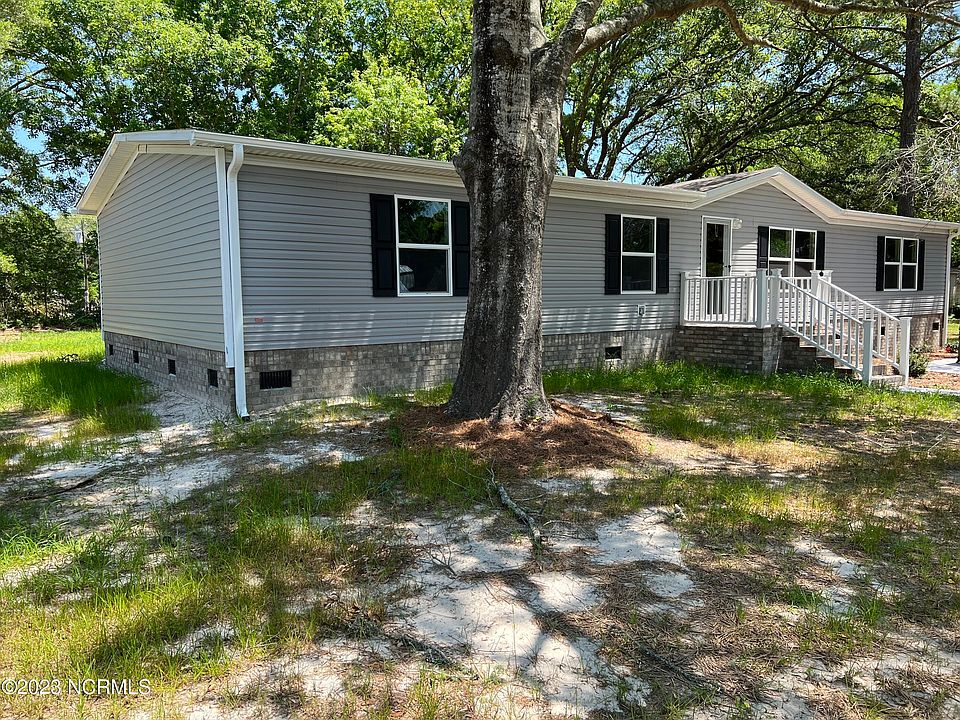 Magnificent Spacious Home Located just Minutes from the Beach! Seller is offering $5000 toward Buyer Closing costs. This Home provides plenty of room with 1,768 sq feet. This Home is called The Pride by Clayton Homes and is Brand New and Move-In Ready. The home features 4 beds and 2 baths, open floor plan, and split bedroom design. Home developed with Wind Zone 2 Construction. It sits on .32 acre lot with beautiful mature trees, gravel driveway, and concrete parking pad with walkway to front porch. The home includes treated wood decks, white seamless gutters, storm doors in front and back, and brick underpinning. The Primary bedroom includes a large walk-in closet and spacious primary bath. The home features a large laundry room with room for a stand-alone freezer. The kitchen is open to living space and is great for entertaining! Kitchen also includes black Frigidaire appliances including; refrigerator/freezer, range/oven, vent hood, and dishwasher. This home is conveniently located just 8 minutes from Holden Beach and only 12 minutes from shops and restaurants.