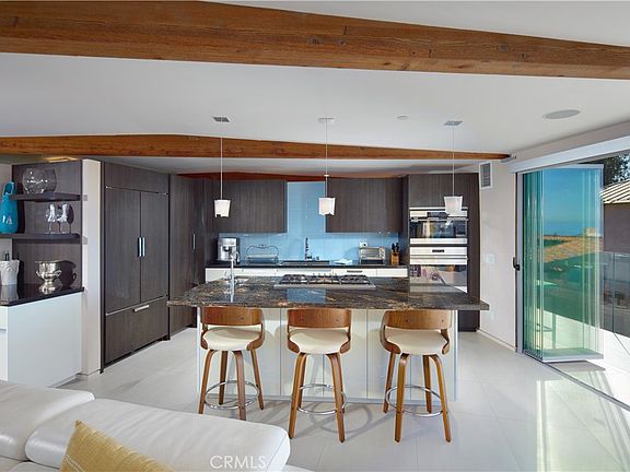 Stylish, remodeled accommodations and awe-inspiring ocean views are enjoyed in equal measure at this Victoria Beach masterpiece. Offering 180-degree ocean vistas, unobstructed Catalina sunsets, and the city lights of North Laguna Beach, this elegant home is a striking example of coastal luxury. Designed by Horst Noppenberger, it seamlessly blends contemporary design with natural, rich materials and bold, modern finishes, creating an ambiance that is both invigorating and inviting. Step inside to discover light-filled, spacious interiors featuring a great room with an 21’ premier folding glass door, exposed-beam ceilings, and floor-to-ceiling windows that open to an approximately 450-square-foot view deck. Granite countertops complement the Thermador cooktop with downdraft, dual Wolf ovens with a steamer oven, and a Sub-Zero refrigerator in the state-of-the-art kitchen. Offering approximately 1,957 square feet of living space, this well-appointed residence features three bedrooms and three-and-a-half bathrooms. The primary suite is enhanced by custom cabinetry, designer closet doors, and granite vanity tops. It also includes an office nook with custom built-ins and two workstations. Seamless porcelain tile flooring runs throughout, adding a touch of elegance to the home. Relish outdoor living with a rooftop deck accessible via dedicated stairs, a rear patio featuring a built-in firepit, and an outdoor shower—ideal for rinsing off after long, sunny days at the beach. Storage solutions abound in the three-car garage, outfitted with epoxy flooring, custom cabinets, a workbench, and overhead shelving. Thoughtfully upgraded to meet modern structural codes, the property boasts a newer electrical panel, fiber optic cable service, LED lighting, dual-zone HVAC, a tankless water heater, perimeter security wiring, and a newer fire sprinkler system. Located just steps from Victoria Beach, 2680 Victoria Dr perfectly balances luxury, functionality, and breathtaking coastal beauty.