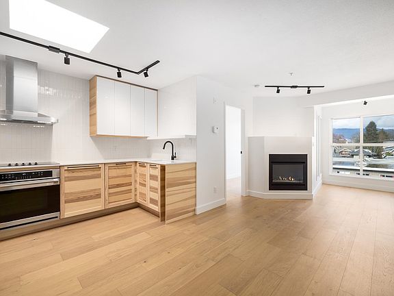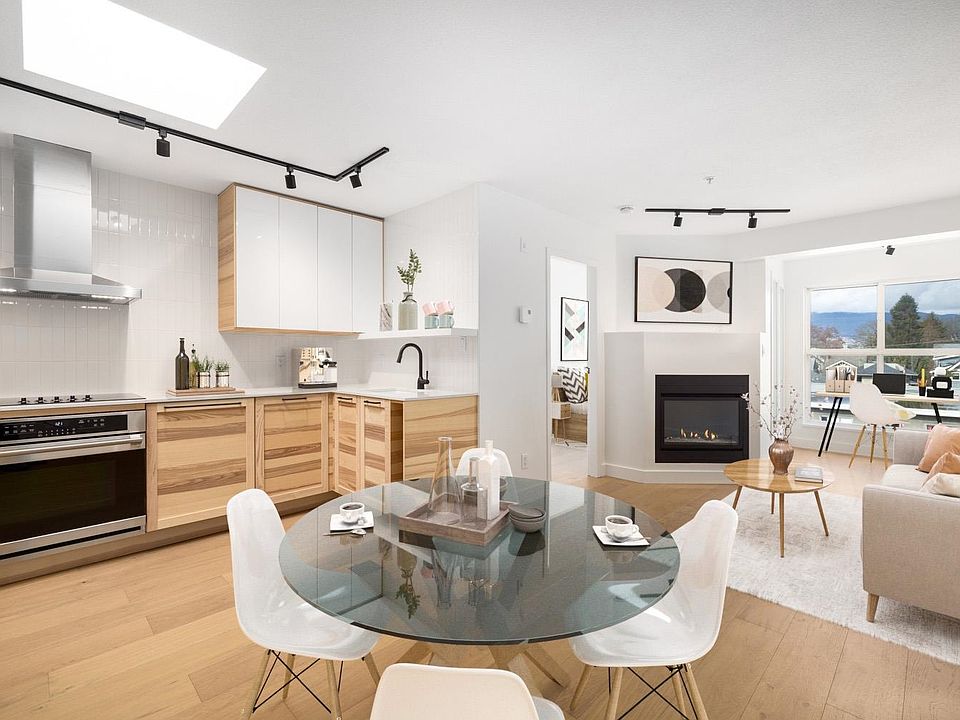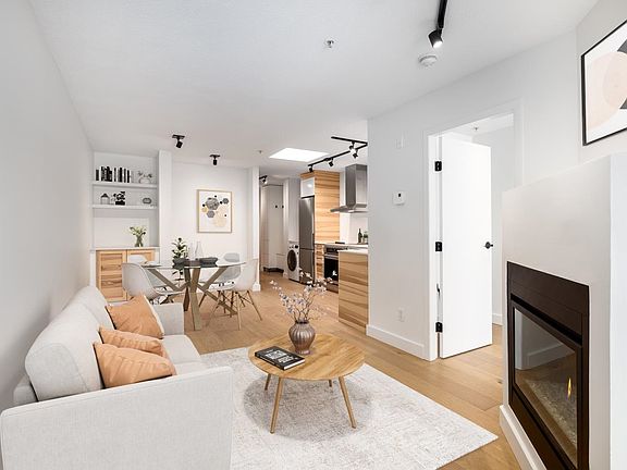 Welcome to the "Star of Kitsilano" - Centrally located just steps from the best the neighborhood has to offer - beaches, parks, shops, restaurants & cafes. This recently renovated TOP FLOOR open concept 1 BDRM+DEN with engineered hardwood flooring throughout features a kitchen with a mix of wood and sleek white cabinetry complimented by quartz countertops & a full S/S appliance package. The large skylight provides ample natural light as you cozy up to the gas fireplace. Take in mountain views from your bedroom or while you work from home in the Den. Insuite laundry (combo W/D can be converted back to stackable) 1 parking stall & 1 storage locker included in this desirable Pet Friendly building (1 dog or 3 cats).