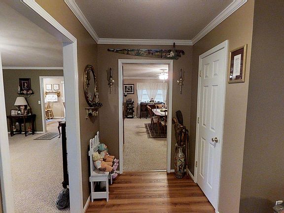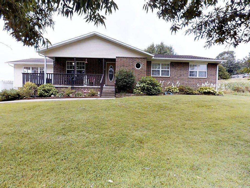Beautiful view from this immaculate like new brick home, full basement with finished bathroom, metal barn, all fenced, pond, garden area, fruit & nut trees. New flooring in living room and dining room. Crown moulding. Home owner has installed a solar blanket in attic and solar fan on roof. Sun room. This is a must see!
