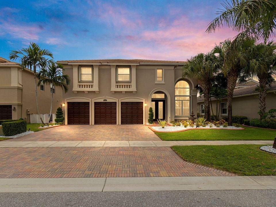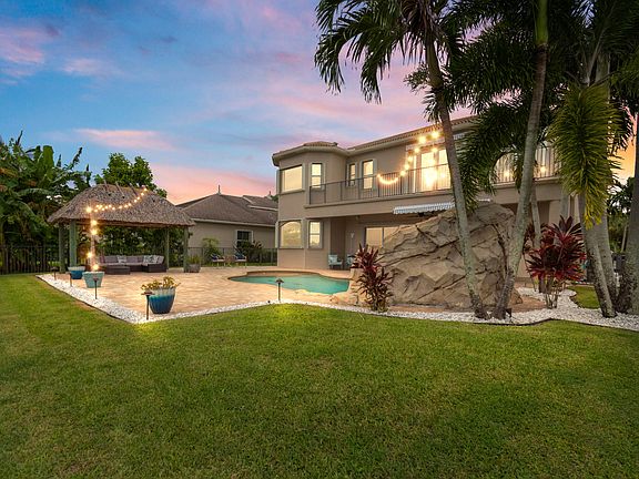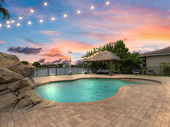 Welcome home to Wellington's prestigious and premier resort style community Olympia! This rarely offered 5185 total sq. ft. Excelsior model includes 5 bedrooms, 1 bedroom on the main floor, plus an office and additional en suite sitting room, with 4.5 baths and is located in the prestigious Cooper Village. This estate has recently undergone a tasteful whole house high end remodel that is on point with style from top to bottom. No stone unturned here, and more wow factors than I can explain, it truly is a must see! The lakefront views are gorgeous from your private backyard lakefront paradise including massive saltwater pool with grotto, rock wall, and rock water slide, as well as a beautiful lighted waterfall. The backyard is truly a stunning paradise oasis that awaits! I can imagine enjoying a cup of coffee outside in quiet solitude in the morning and then a glass of red as you watch the sun set over the lake and preserve. The custom upgraded and lighted mature palm tree landscaping is a beautiful addition to your personal paradise.The outdoor oasis also includes a huge newly rethatched tiki hut for shaded entertaining, which is also lighted and has electricity, along with a huge fully covered outdoor kitchen with sun setter awning. All while looking out at your long lake views that are the best all of Olympia has to offer. From this backyard you are looking at Olympia's largest and most sought after lake, in addition to 5 canal views extending from the big lake.
