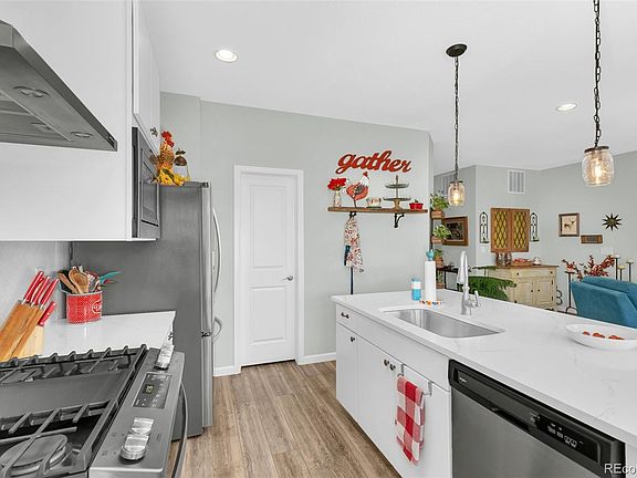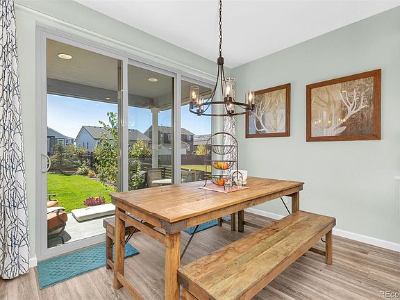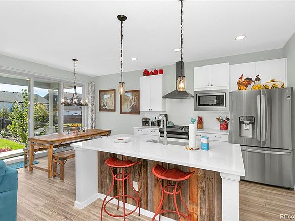 Why wait to build when you can have this turn-key 2-year-old home? This stunning home welcomes you with an open concept layout, complete with a custom wood accent wall, a gorgeous upgraded kitchen featuring brand new SS appliances, a range hood, quartz countertops, and a custom backsplash, along with a wonderful pantry and island for extra storage and prep space. The kitchen opens to the spacious dining room and the family room featuring a stunning custom wood fireplace and mantel to enjoy during our Colorado winters. Relax in your large Master retreat filled with natural light. Step into your private ensuite with double sinks, a tiled shower, and a large walk-in closet. Down the hall, you will find the perfectly placed laundry room, as well as 2 additional bedrooms and a full bath to complete this ranch floorplan. Head to the triple backdoor slider along with your furry friends and enjoy the stunning landscaped yard featuring a large concrete patio area for dining, games, or extra storage for all your toys. This space is perfect for year-round entertaining and move-in ready! Conveniently located near Buckley Air Force Base, I-70, and E-470 for a quick commute to DIA, Denver, and Stapleton. The Harmony community amenities include an incredible pool, clubhouse, dog park, playground, basketball courts, and more. This home is a must-see and the perfect place to call home.