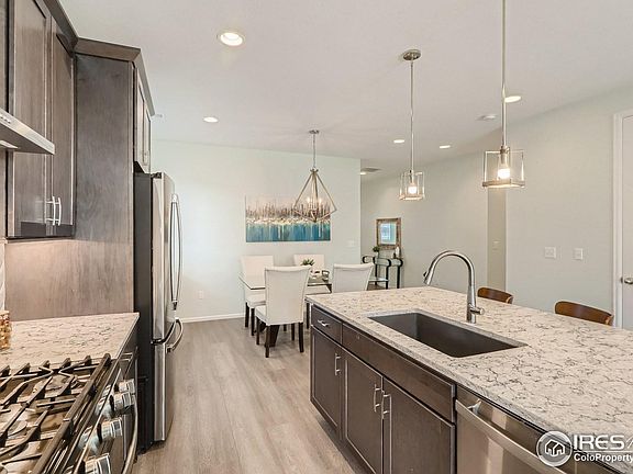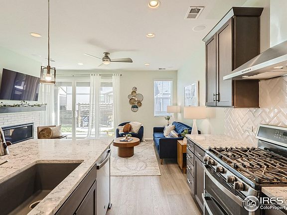 Incredible opportunity to purchase a like new Onyx plan by Richmond Homes priced over $100,000 below replacement cost! Open plan centers around a fully loaded kitchen with Pietra quartz, quartz sink, huge island, maple cabinets, backsplash and upgraded ss appliances including dual oven gas range, designer hood, and French door refrigerator. Modern, linear fireplace and oversized glass doors define an airy great room. Through double doors the backyard oasis with covered patio and two additional patio areas, pergola, and privacy fence. Private primary suite features sleek barn door, walk-in closet, and ensuite with upgraded double sink vanity, quartz, and custom walk-in shower. Owned solar panels, upgraded insulation and electric water heater and furnace keep utility bills low. This better than new ranch rivals custom build with high end finishes throughout. Approximately $100,000 in builder upgrades plus $13,000 in professional landscaping. Exciting new community with pool, fitness center, basketball, volleyball, dog park, trails and more!